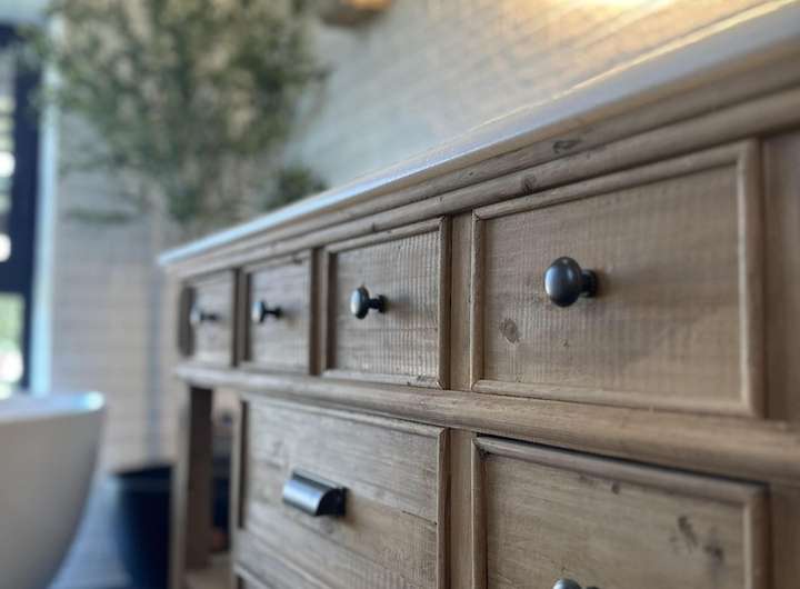 Doppelwaschtisch aus Antikholz mit Marmorplatte und