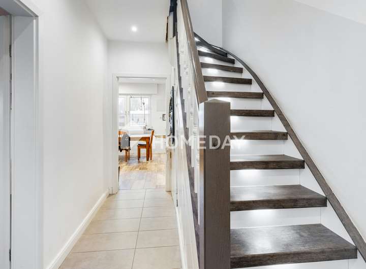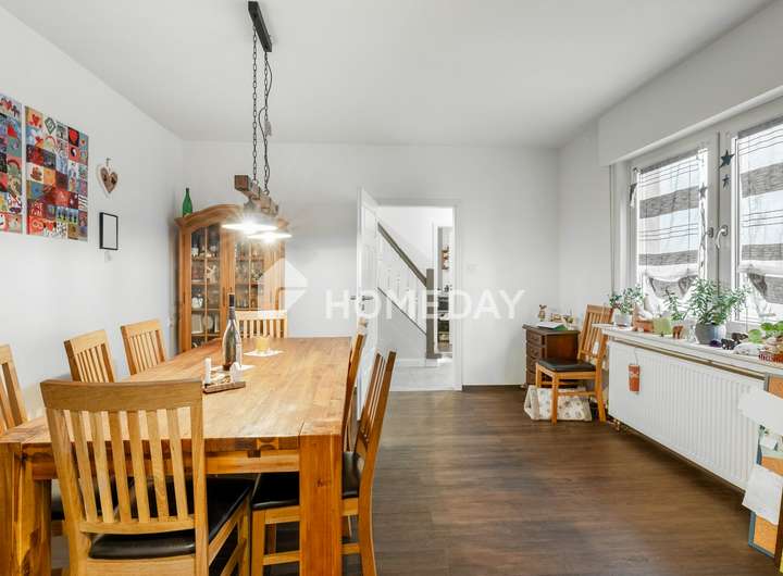 Das Erdgeschoss überzeugt zudem mit einem großzügigen Esszimmer, das als Durchgangszimmer fungiert und durch eine große Schiebetür nahtlos mit dem Wohnzimmer verbunden ist. Letzteres verfügt über einen separaten Eingang, sodass es direkt von außen betreten werden kann – eine ideale Lösung für eine flexible Nutzung des Wohnbereichs.