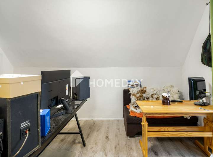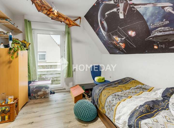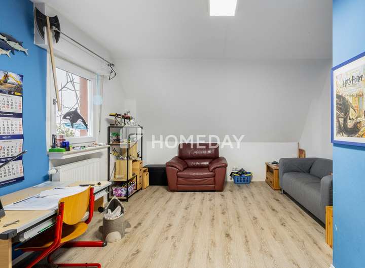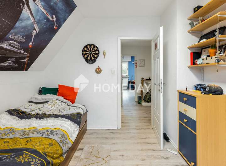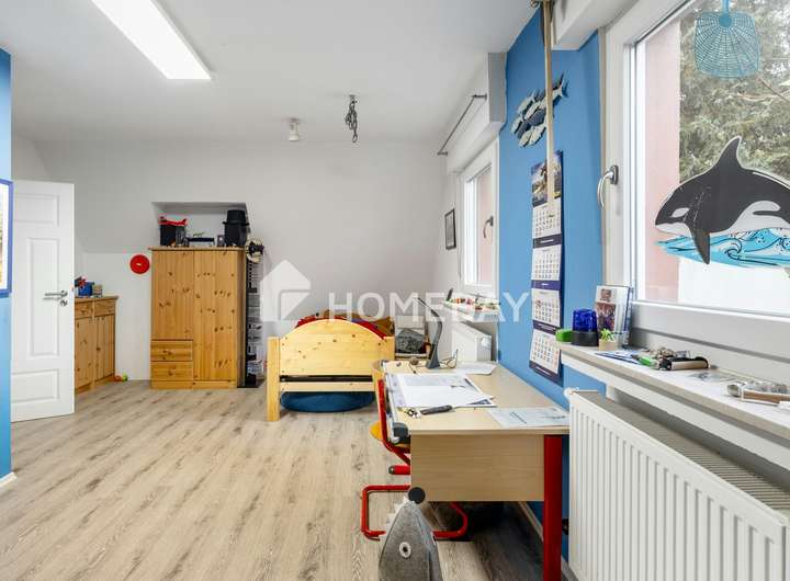 Im Obergeschoss erwartet Sie ein weiterer Flur, der drei Zimmer miteinander verbindet. Hier finden Sie ein Schlafzimmer, das als Durchgangszimmer für das zweite Kinderzimmer dient, sowie ein weiteres geräumiges Kinderzimmer. Das Badezimmer auf dieser Etage ist mit einer Dusche ausgestattet. Sämtliche Bäder verfügen über Fenster, die für eine angenehme Belüftung und viel Tageslicht sorgen.