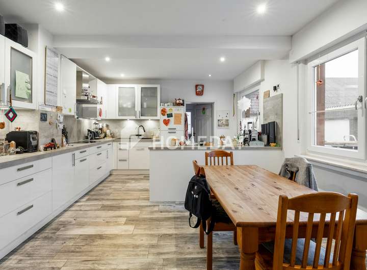 Beim Betreten des Hauses empfängt Sie ein offener Flur, der direkt in die großzügige Küche übergeht. Hier sorgt ein Kamin für eine behagliche Atmosphäre und lädt zu gemütlichen Stunden ein. Die moderne Einbauküche mit Tresenbereich bietet viel Platz und ist ideal für gesellige Kochabende. Über die Küche gelangen Sie in einen zweiten Flur, der das Badezimmer, das Gäste-WC sowie einen geräumigen Abstellraum erschließt. Zudem führt dieser Bereich direkt in das Elternschlafzimmer, das sich ebenfalls auf dieser Ebene befindet.