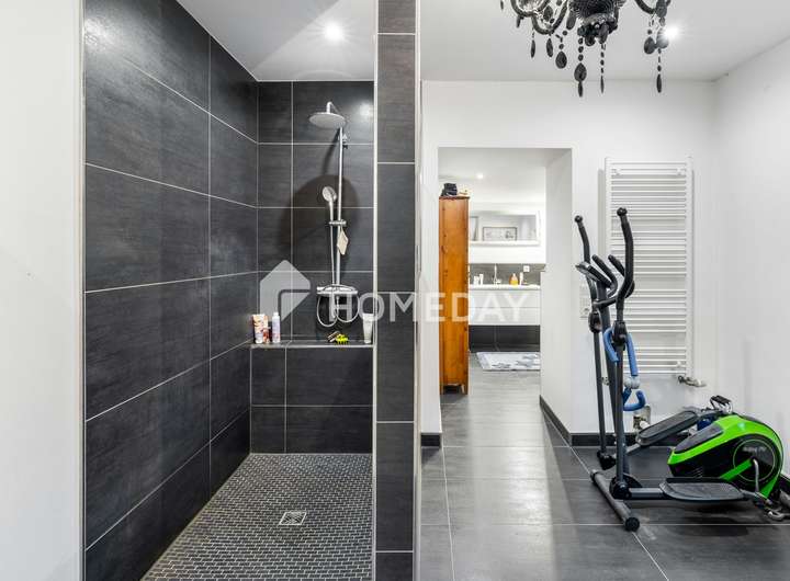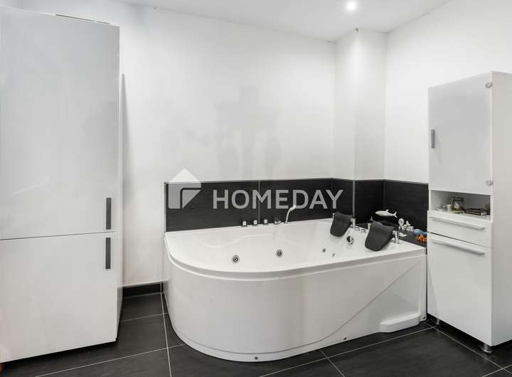 Das Badezimmer im Erdgeschoss ist mit einer Badewanne sowie einer modernen Regendusche ausgestattet und bietet damit höchsten Komfort.