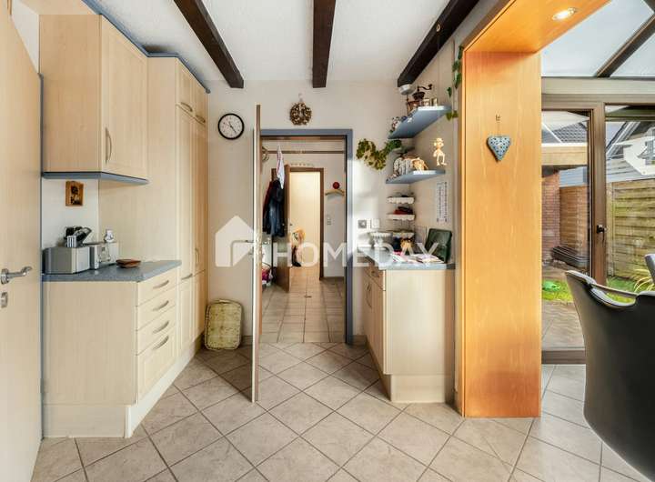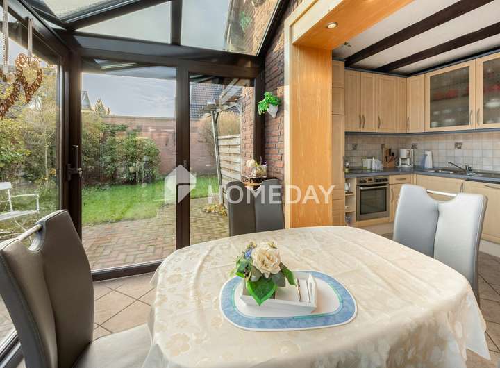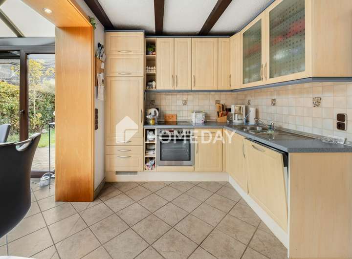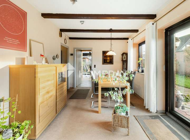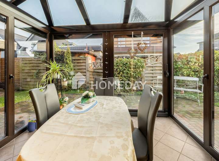 Ein weiteres Highlight ist die Raumaufteilung rund um die Küche: Durch einen offenen Zugang gelangen Sie in den festen Wintergarten, der aktuell als lichtdurchflutetes Esszimmer dient. Hier genießen Sie den Blick ins Grüne zu jeder Jahreszeit. Praktische Aspekte kommen ebenfalls nicht zu kurz: Ein Hauswirtschaftsraum sowie weitere Abstellräume bieten reichlich Platz für Vorräte und Alltagsgegenstände. Ein Gäste-WC rundet das Raumangebot im Erdgeschoss ab.