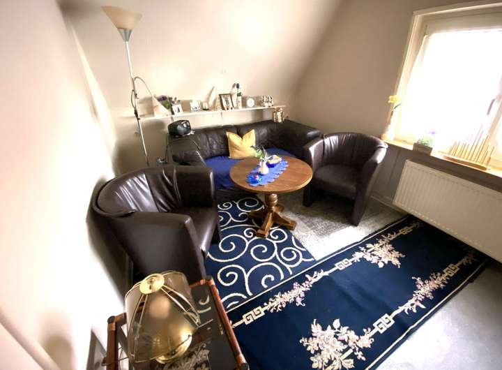 Über die nostalgische Treppe gelangen Sie in das Obergeschoss. Hier befindet sich das Duschbad, Kinder- und Schlafzimmer, sowie ein weiteres kleines Zimmer, welches sich auch als Büro nutzen lassen könnte. Der kleine Vorraum eignet sich besonders gut für eine Sitzgruppe.