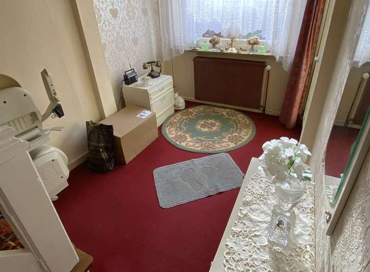 • Fußbodenbelagsmix aus Teppich und Fliesen