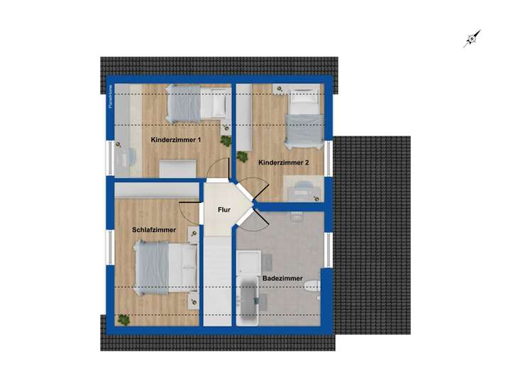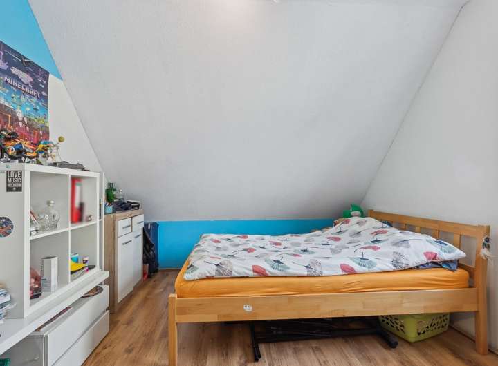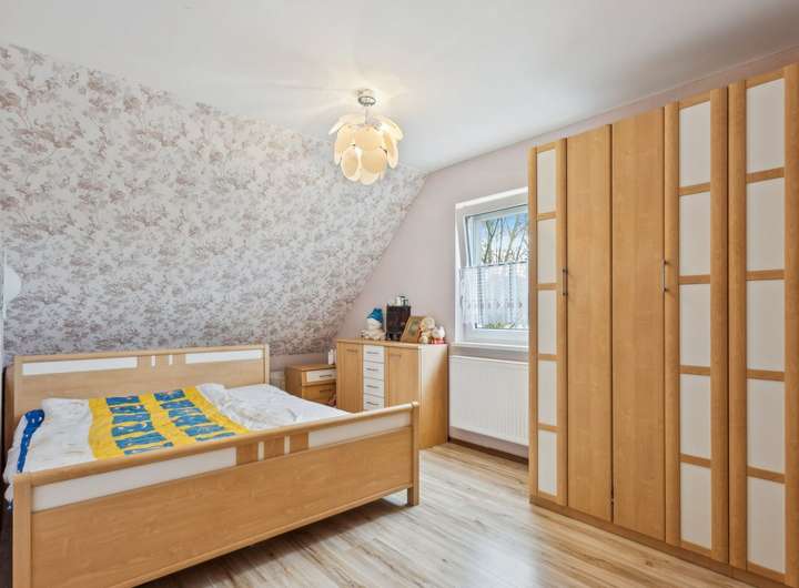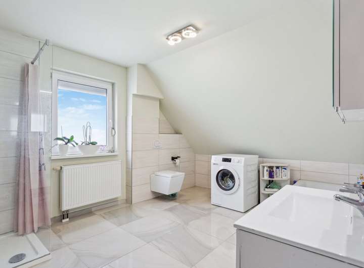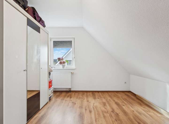Das Obergeschoss bietet ein großes Badezimmer, das sowohl mit einer Badewanne als auch einer Dusche ausgestattet ist, sowie drei vielseitig nutzbare Räume – ideal als Schlafzimmer, Kinderzimmer oder Homeoffice.