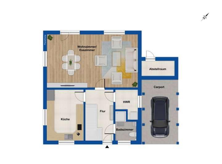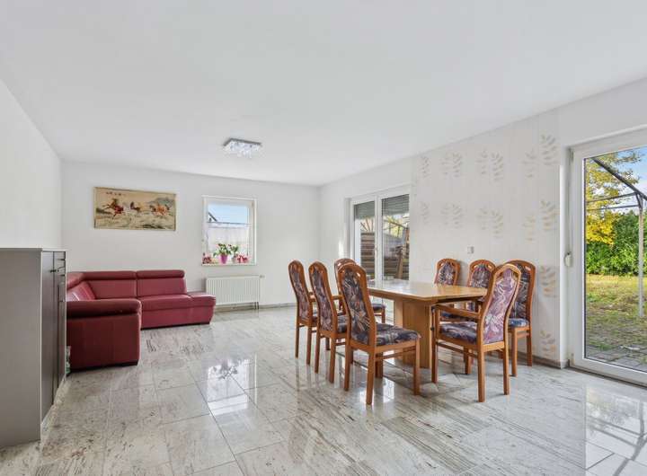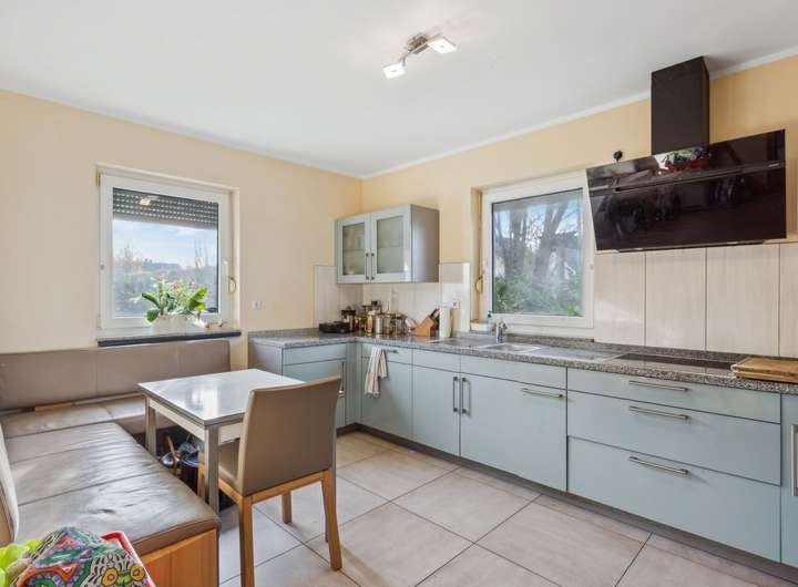 Im Erdgeschoss erwartet Sie eine großzügige Wohnküche, die genügend Platz für gemeinsames Kochen und Essen bietet. Ein Gäste-WC sowie ein praktischer Hauswirtschaftsraum sorgen für zusätzlichen Komfort im Alltag. Der helle Wohn- und Essbereich bildet das Herzstück des Hauses und öffnet sich zur angrenzenden Terrasse, die direkt vom Wohnraum zugänglich ist und zu entspannten Stunden im Freien einlädt.