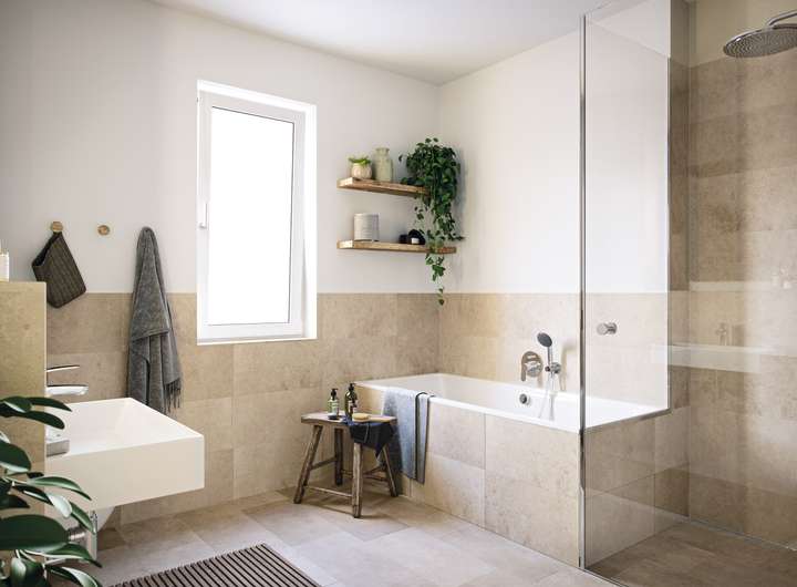 • Modernes Bad mit Badewanne sowie Waschtisch, WC mit Softclose-Funktion, bodengleicher Dusche inklusive