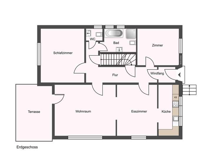 Eingangsdiele, Küche mit angrenzendem und geräumigem Wohn-/Essbereich, welcher direkten Zugang zum Terrassenbereich darstellt, Gäste-WC, Badezimmer mit Wanne sowie Dusche, zwei Zimmer, welche beliebig genutzt werden können