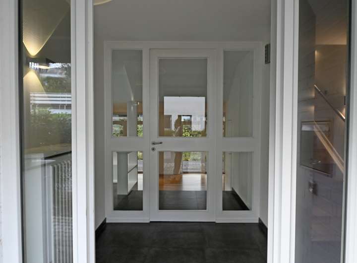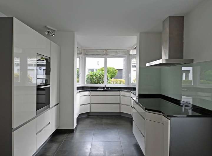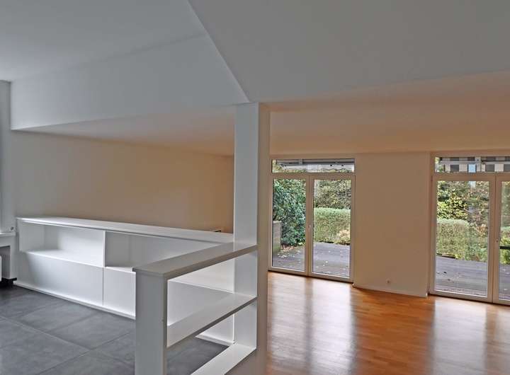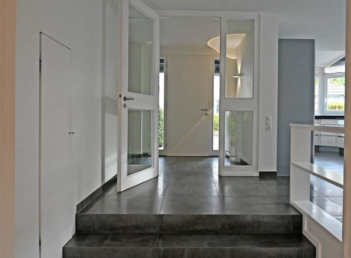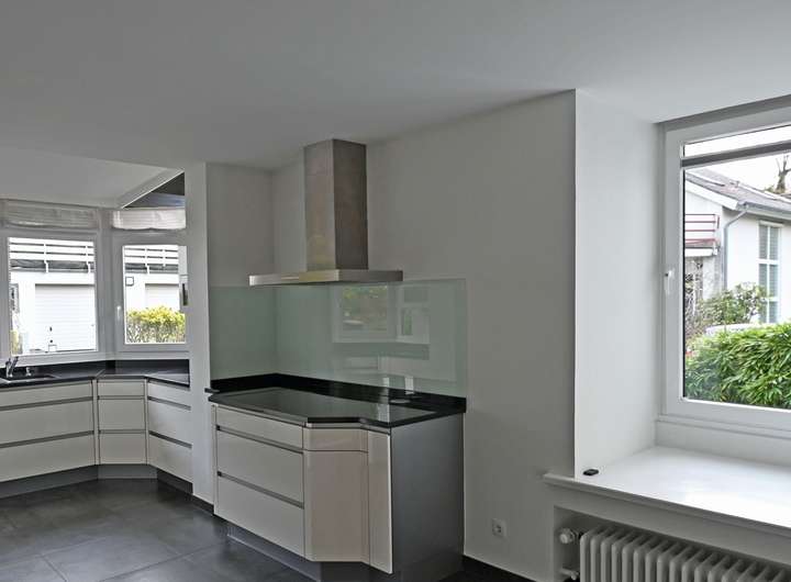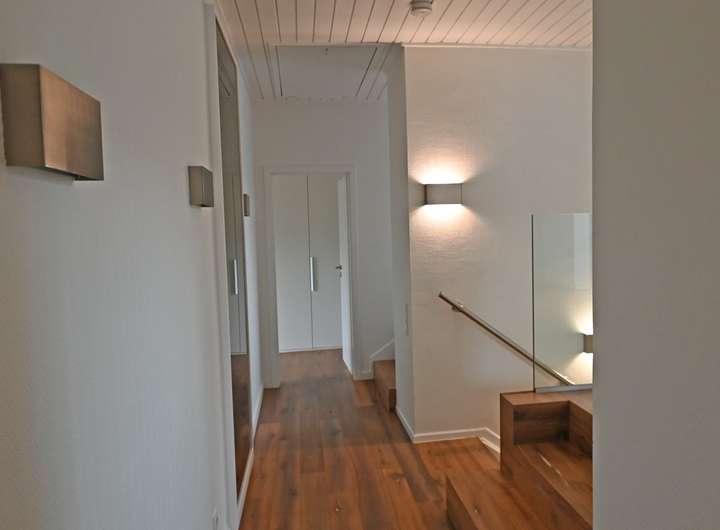 Graue Keramikböden und Massivholz-Parkettböden, sehr chice, breite Geschosstreppe mit zum Parkettboden passenden Stufen, ganz moderne, weiße Einbauküche mit allem Komfort, offener Kamin, hochwertige Schreinereinbauten in weiß, weiße Türen bzw. Ganzglastüren, ein sehr modernes, neuwertiges Hauptbad, ein Tageslicht-Sauna-Bad im Untergeschoss sowie ein neues Gäste-WC. Viele Downlights im gesamten Haus, bodentiefe Verglasungen. Fitnessbereich mit Sauna, Schwalldusche, Ruhezone und Tageslicht :), Bangkirai-Terrasse, sehr schön angelegter Garten, Doppelgarage mit vorgelagerten Stellplätzen.
