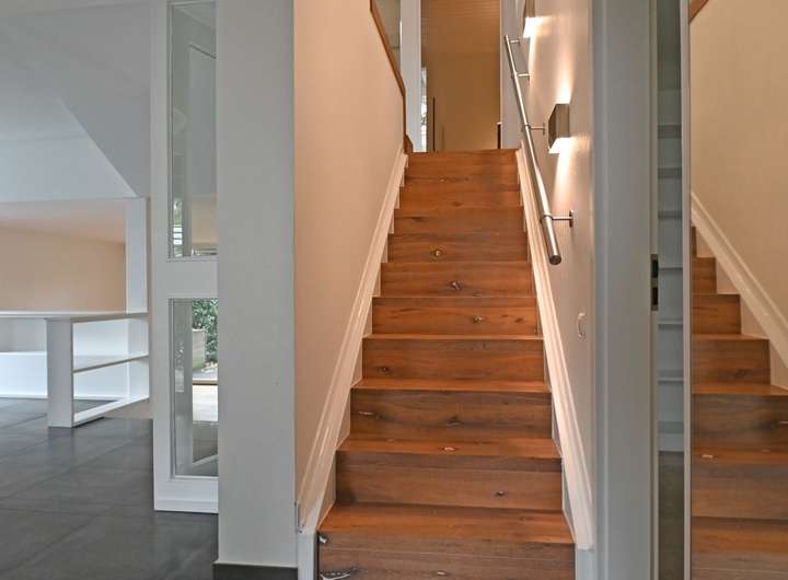 Ein rundherum stimmiges Haus, das mit seinem tiefgezogenen Dach schon von außen norddeutsches Flair verbreitet. Es gehört zu der Art Häuser, vor denen man stehen bleibt und den Wunsch hat, sie von innen sehen zu dürfen. Und beim Betreten des Hauses bestätigt sich dann genau das, was man vermutet: Alles ist hier einladend, geschmackvoll und aus einem Guss mit der Farbe Weiß, kombiniert mit Holz. Die vielen Fenster beziehen das herrliche Grün der Umgebung mit ein und verbreiten Urlaubstimmung, gleichzeitig ist man sehr gut angebunden an die umliegenden Großräume. Damit erklärt sich auch die Attraktivität des Standorts aus Richtung Düsseldorf, die in den vergangenen Jahren konsequent zugenommen hat.