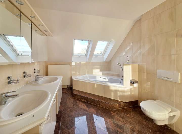 Dieses stilvolle Einfamilienhaus wurde 1997 in einer ruhigen, naturnahen Wohngegend in Massivbauweise erbaut. Das ca. 469 m² große, nahezu ebene Grundstück bietet im ansprechend angelegten Garten viel Platz für Spiel und Spaß. Schon auf den ersten Blick fällt der besondere Flair ins Auge, da das Haus im japanischen Stil konzipiert wurde. Mit einer Wohnfläche von ca. 227 m² und sieben großzügigen Räumen ist es ein ideales Zuhause für Familien. Ein besonderer Vorzug sind die überdurchschnittlichen Raumhöhen, die ein großzügiges Wohngefühl vermitteln: Im Erd- und Untergeschoss beträgt die Deckenhöhe ca. 2,60 m und im Dachgeschoss ca. 2,50 m. Das Erdgeschoss besteht aus einem großen Wohn- und Essbereich. Zahlreiche Fenster und Terrassentüren durchfluten diesen mit Licht und gewähren Zugang zum Außenbereich. Eine schön angelegte Terrasse mit angrenzendem Garten lädt zur Erholung ein. Im Wohnzimmer sorgt ein behaglicher Specksteinofen an kühlen Tagen für angenehme Wärme. Die separate Küche ist über eine praktische Durchreiche mit dem Essbereich verbunden. Da sich auf dieser Etage auch ein Schlafzimmer und ein Badezimmer mit Dusche befinden, kann das Haus selbst im Alter nahezu barrierefrei bewohnt werden. Im Dachgeschoss eignen sich drei ca. 16 m² große Zimmer optimal als Schlaf-, Kinder- oder Arbeitszimmer. Zwei davon haben Zugang zum sonnigen Balkon mit tollem Gartenblick. Ein weiteres Zimmer steht für Gäste oder als Büro zur Verfügung. Das geschmackvolle Tageslichtbad ist mit Badewanne, Dusche, Doppelwaschbecken und WC ausgestattet. Die Fußbodenheizung im Bad bietet weiteren Komfort. Der Dachboden dient als praktische Nutzfläche und ist über eine Einschubtreppe im Flur erreichbar. Im Untergeschoss kann die Einliegerwohnung vielseitig genutzt werden – ob als separates Büro, für das erwachsene Kind, eine Pflegekraft oder als Gästebereich. Gute Belichtung und ein eigener Zugang ermöglichen zusätzliche Mieteinnahmen. Komplettiert werden die Räumlichkeiten durch den Heiz- und Technikraum sowie zwei große Abstellräume, wobei in einem bereits ein Starkstromkabel für eine mögliche Sauna vorhanden ist. Ein überdachter sowie ein davorliegender, offener Stellplatz unterstreichen die Attraktivität dieses Immobilienangebots.