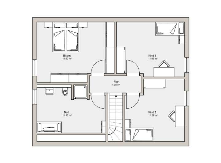 Im Dachgeschoss des Satteldachhauses befinden sich zwei Kinderzimmer, ein Elternschlafzimmer und das geräumige Familienbad.