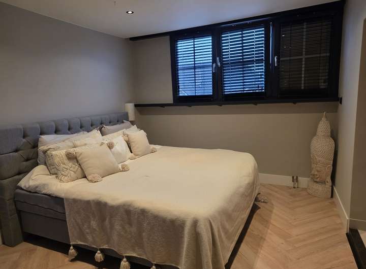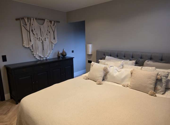 Elternschlafzimmer mit PVC Fischgrätenmuster und eine Ankleide (walk-in-closet).