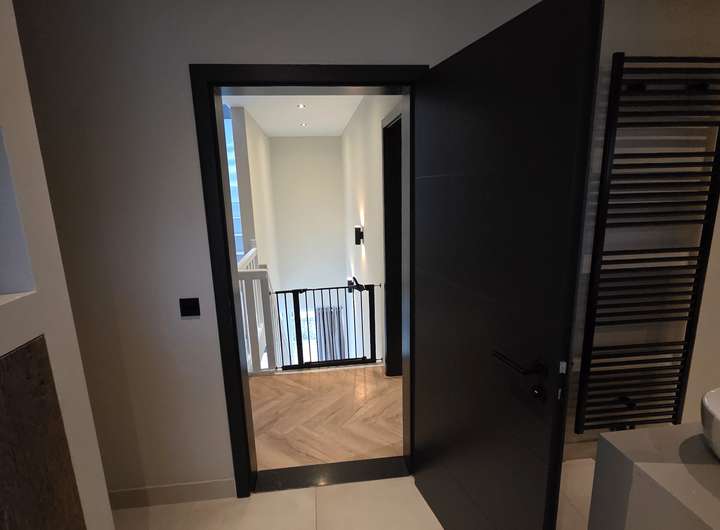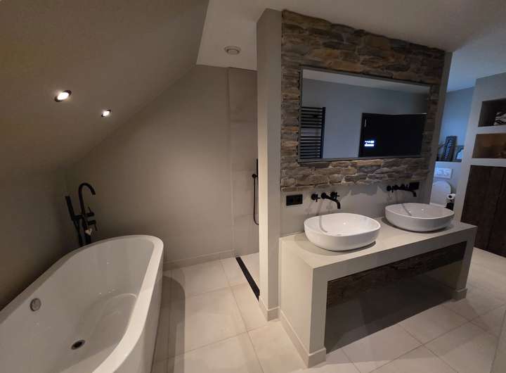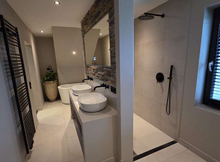 Neues Bad mit freistehende Wanne, schwarze Wasserhähne, zweiseitig begehbare, ebenerdige Dusche mit 2 Duschen. Doppelter Waschtisch, Handtuchheizkörper usw.