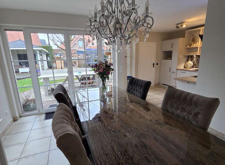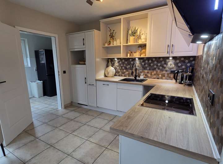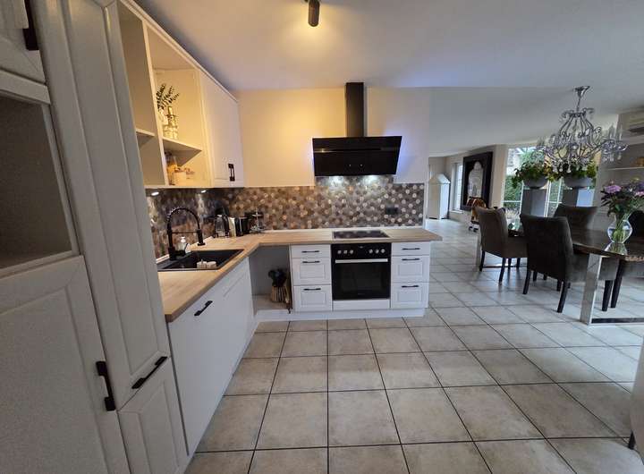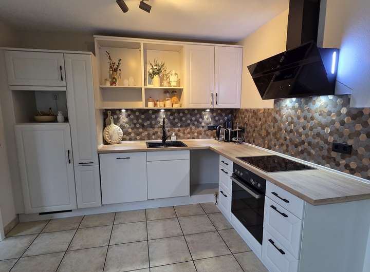 Küche: Moderne Küche mit (meist) neuen Einbaugeräte: Kühlschrank, Gefrierschrank, Induktionsfeld, Anzugshaube, Backofen, Spülmaschine.