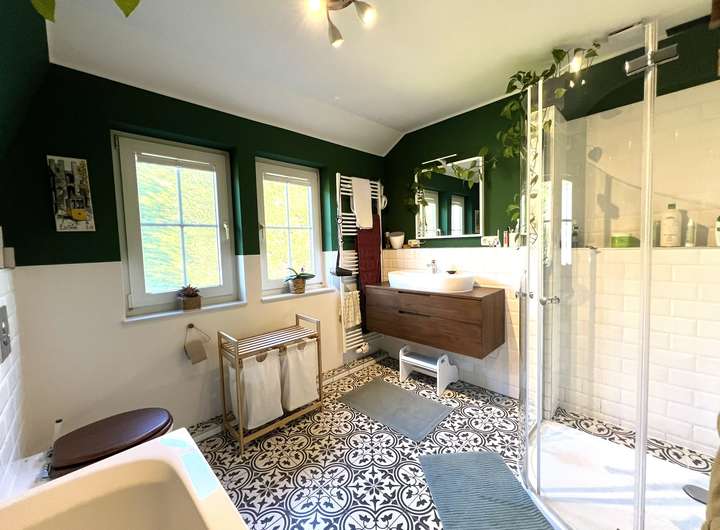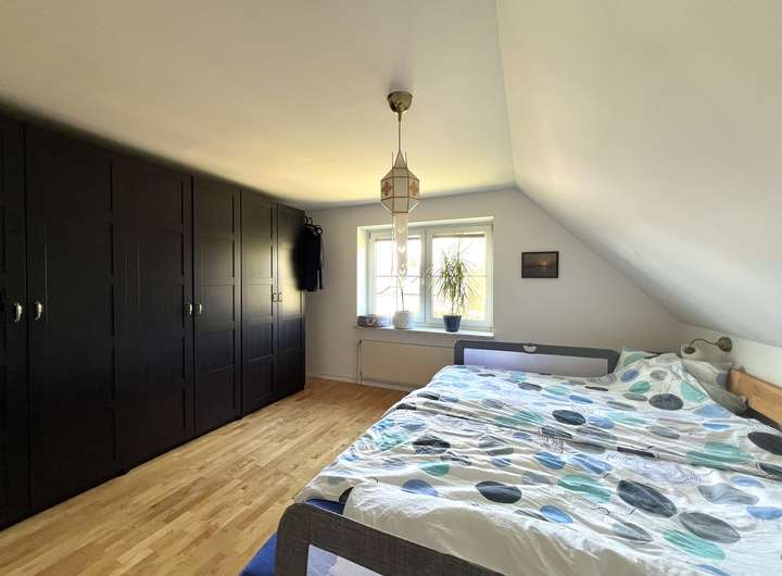 Das Obergeschoss verfügt über drei Schlafzimmer, die ausreichend Platz für individuelle Gestaltungsmöglichkeiten bieten. Das Badezimmer ist sowohl mit einer Dusche als auch einer Badewanne ausgestattet, was für zusätzlichen Komfort sorgt. Die Schlafzimmer profitieren von einem angenehmen Raumklima und bieten einen schönen Blick auf die ruhige Nachbarschaft.