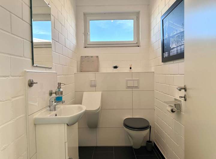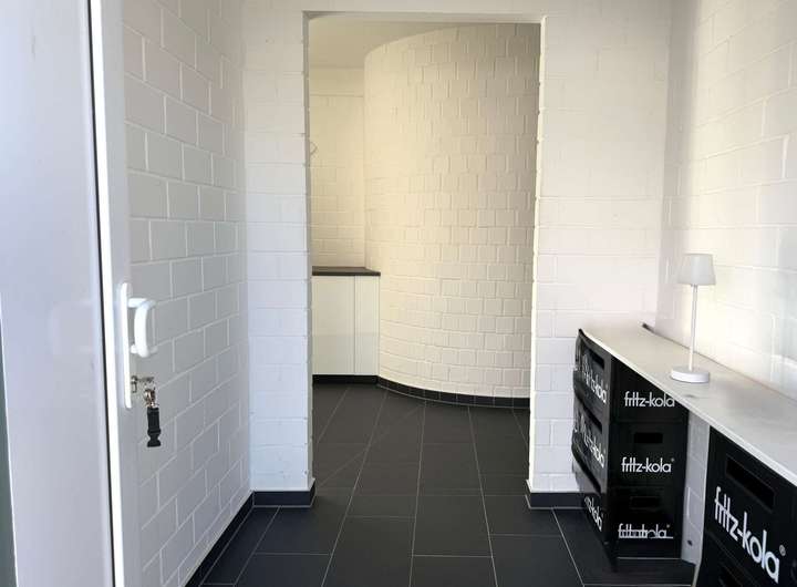 Das Gebäude gliedert sich in einen Wohn- bzw. Bürotrakt mit zwei separaten Zimmern und einem sehr großzügigen Badezimmer, ausgestattet mit Dusche, Badewanne, Bidet, WC und hochwertiger Sanitärausstattung. Zwei Abstellräume sorgen für zusätzlichen Stauraum und Ordnung.