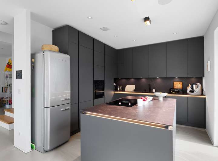 Die offene Wohnküche, elegante Bäder mit großformatigen Fliesen, ein fugenloser Boden im gesamten Wohnbereich sowie edles Parkett in den Schlafzimmern spiegeln den gehobenen Anspruch dieser Immobilie wider.