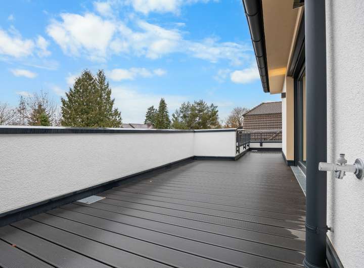 + Umlaufende Dachterrasse: Die großzügige, umlaufende Dachterrasse ist mit hochwertigen WPC-Dielen ausgestattet und bietet durch ihre Ausrichtung nach drei Himmelsrichtungen optimale Sonneneinstrahlung zu jeder Tageszeit. Die Terrassenfläche ist mit stimmungsvoller Außenbeleuchtung ausgestattet und schafft ein einzigartiges Ambiente für entspannte Abendstunden unter freiem Himmel.