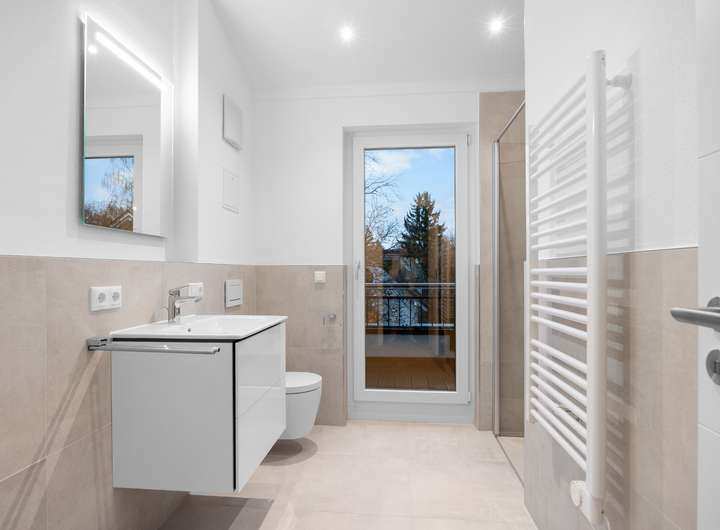 + Badezimmer: Das modern gestaltete Bad verfügt über eine bodengleiche Dusche, ein WC, einen edlen Waschtisch mit Unterschrank sowie einen Handtuchheizkörper, der in den wärmeren Jahreszeiten durch Elektrik betrieben werden kann. Die großformatigen Fliesen schaffen eine edle, großzügige Atmosphäre. Besonders praktisch: Der Waschmaschinenanschluss befindet sich direkt im Bad. Hier wurde besonderer Wert auf hochwertige Sanitärartikel und zeitloses Design gelegt. Die bodentiefe Tür zur Dachterrasse schafft zusätzlich ein einzigartiges Spa-Gefühl mit direktem Zugang zum Außenbereich.