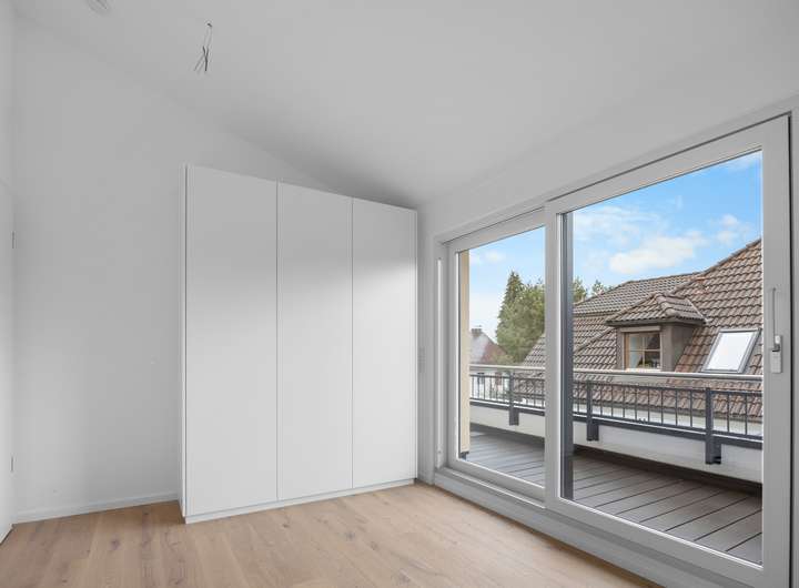 + Schlafzimmer: Das großzügige Schlafzimmer überzeugt durch einen praktischen Einbauschrank, der optimalen Stauraum bietet. Die breite Fensterfront zur Dachterrasse sorgt für lichtdurchflutete Räume und ein offenes Wohngefühl, wobei Ihre Privatsphäre dennoch gewahrt bleibt. Der perfekte Rückzugsort für erholsame Nächte mit dem Komfort direkten Terrassenzugangs.