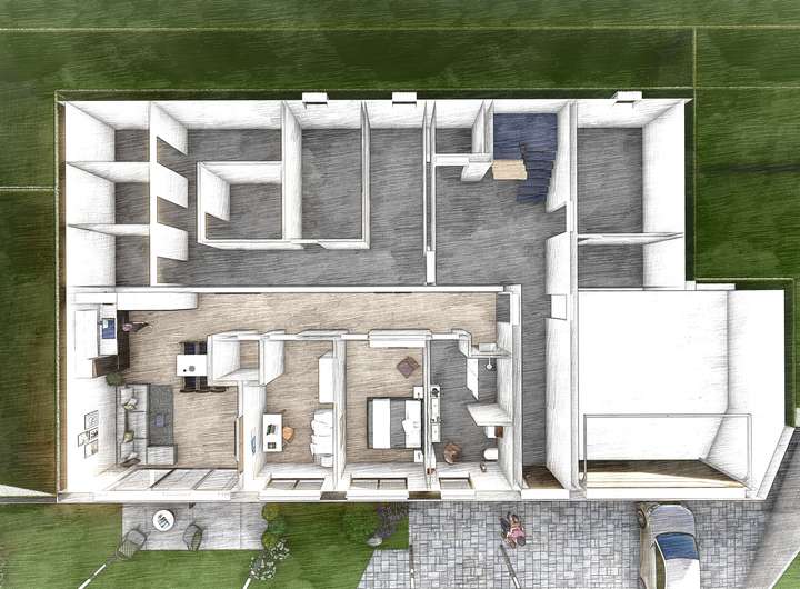 Die Architektur stellt den Wohnkomfort in den Mittelpunkt. Großzügige Fensterflächen schaffen helle, offene Räume und geben den Blick nach Süden und Süd-Westen frei. Wohn-, Ess- und Kochbereiche sind bewusst so orientiert, dass sie die natürliche Belichtung optimal nutzen und ein lebendiges, freundliches Wohngefühl erzeugen. Tageslichtbäder, funktional gestaltete Grundrisse und die hochwertige Ausstattung unterstreichen den Anspruch eines Hauses, das gleichermaßen elegant wie alltagstauglich ist.