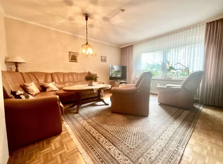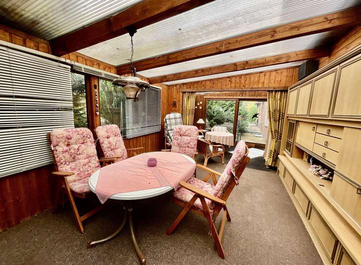 Der einladende Wintergarten bietet einen herrlichen Ausblick auf den gepflegten Vorgarten, der mit einer Hofeinfahrt sowie einer Garage und einem Carport als Parkmöglichkeiten überzeugt.