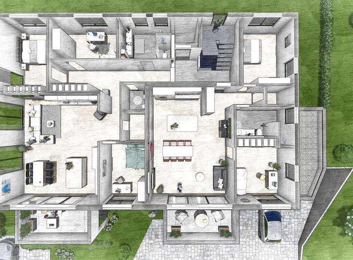 Die Architektur stellt den Wohnkomfort in den Mittelpunkt. Großzügige Fensterflächen schaffen helle, offene Räume und geben den Blick nach Süden und Süd-Westen frei. Wohn-, Ess- und Kochbereiche sind bewusst so orientiert, dass sie die natürliche Belichtung optimal nutzen und ein lebendiges, freundliches Wohngefühl erzeugen. Tageslichtbäder, funktional gestaltete Grundrisse und die hochwertige Ausstattung unterstreichen den Anspruch eines Hauses, das gleichermaßen elegant wie alltagstauglich ist.