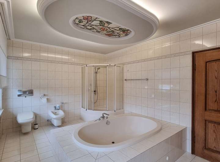 Das Obergeschoss bietet ein großes Schlafzimmer mit Zugang zum Balkon, zwei Kinderzimmer sowie ein kleineres Zimmer, das sich ideal als Büro, Gästezimmer oder Hobbyraum eignet. Das von Licht durchflutete Badezimmer präsentiert sich als echtes Highlight: Mit Dusche, Badewanne und Doppelwaschbecken bietet es höchsten Komfort.