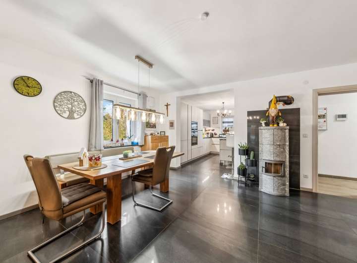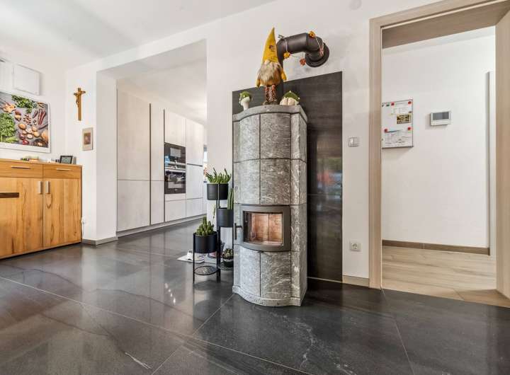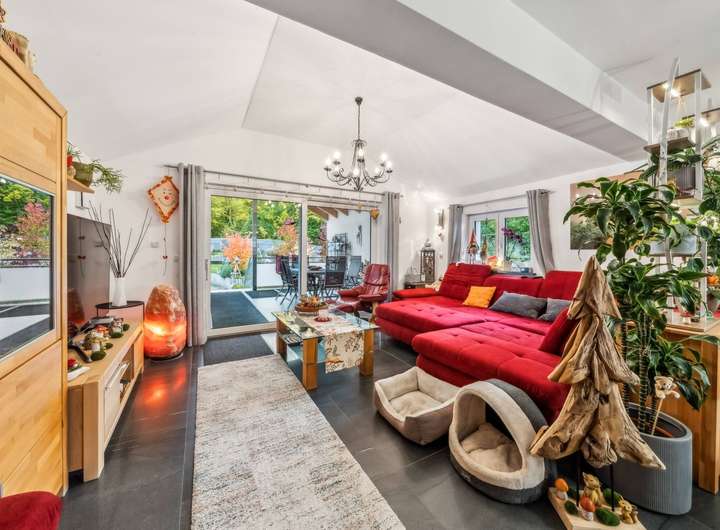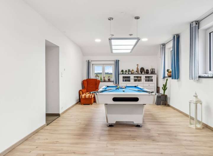 Die übrige Wohnfläche verteilt sich auf das ebenerdige Untergeschoss mit zwei Gästezimmern und WC und das weitläufige Erdgeschoss darüber, das wegen der leichten Hanglage eben zum Garten hin ausgerichtet ist. Im Westflügel des Gebäudes sind hier das mit edlen Steinfliesen in Schieferoptik belegte Wohnzimmer (ca. 38 m²) und die offene Küche untergebracht. Ein Specksteinofen sorgt für behagliche Wärme im Winter. Das Wohnzimmer öffnet sich zu dem mit einem schönen Holzgiebel überdachten Freisitz, und von dort führt eine kleine Treppe in den Garten. An zwei kleinere Zimmer und ein Bad schließt sich ein größerer Raum (ca. 32 m²) an, der derzeit als Billardraum genutzt wird.