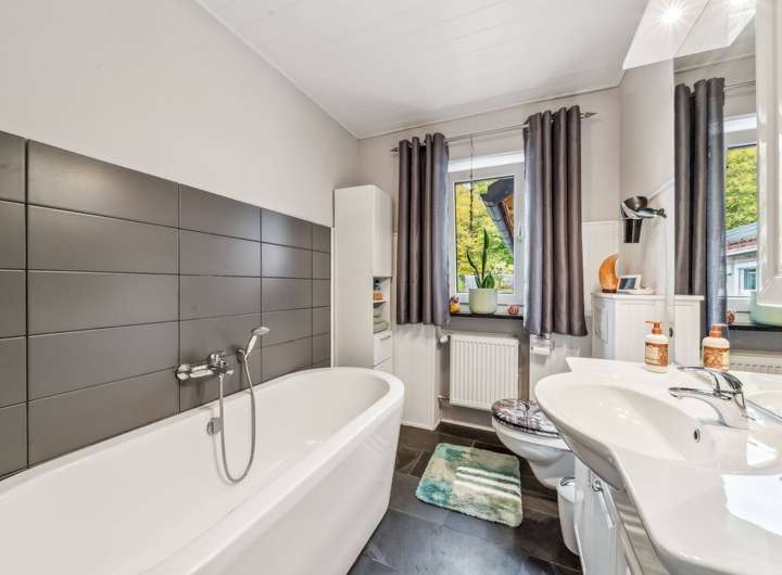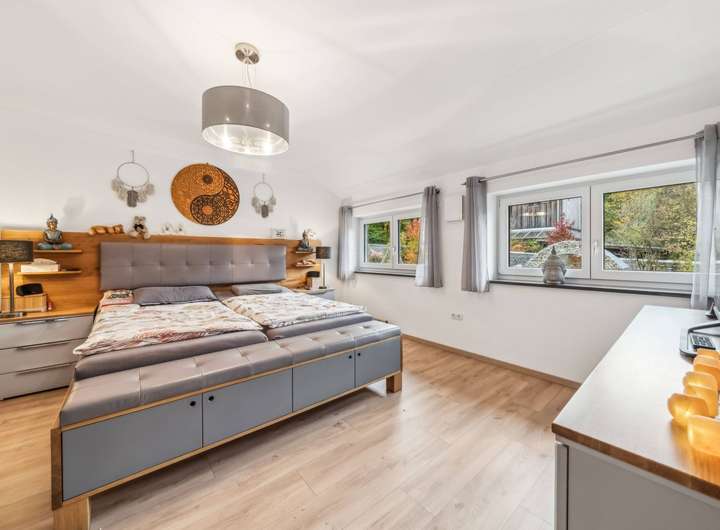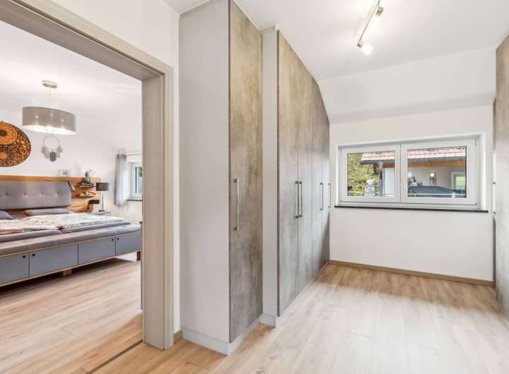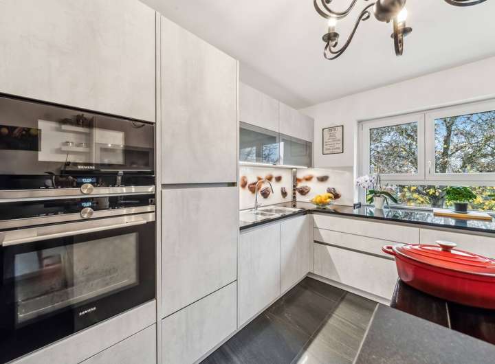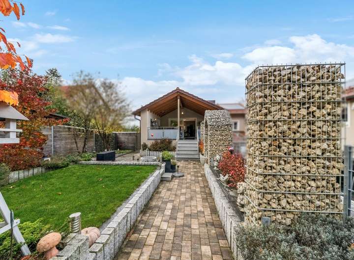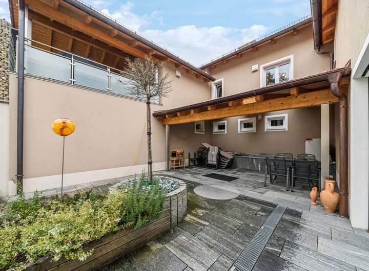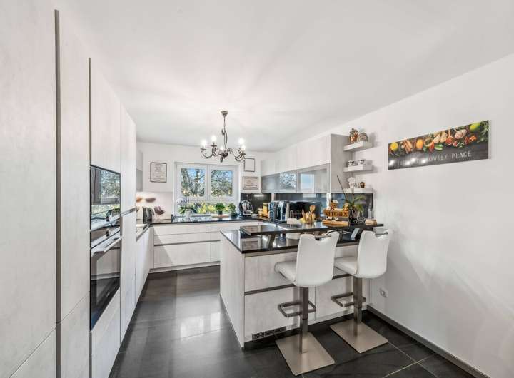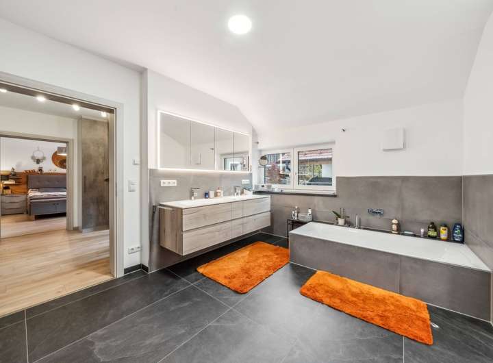 Im Kern handelt es sich um ein ca. 1965 errichtetes Einfamilienhaus, das ca. 2020 bis 2023 kernsaniert und durch sehr großzügige Erweiterungsbauten zu einer luxuriösen Villa in Form eines Dreiseithofes umgestaltet wurde. Von den ca. 407 m² Wohnfläche entfallen ca. 96 m² auf das wunderschöne Schwimmbad im Untergeschoss des Ostflügels. Das ca. 11 m lange Becken mit Ruhebereich und Sauna lässt keine Wünsche offen. Vor der langen Front mit Fenstertüren liegt der nicht einsehbare Innenhof mit überdachtem Freisitz und kleinem Teich, ein herrlicher Relaxbereich im Sommer!