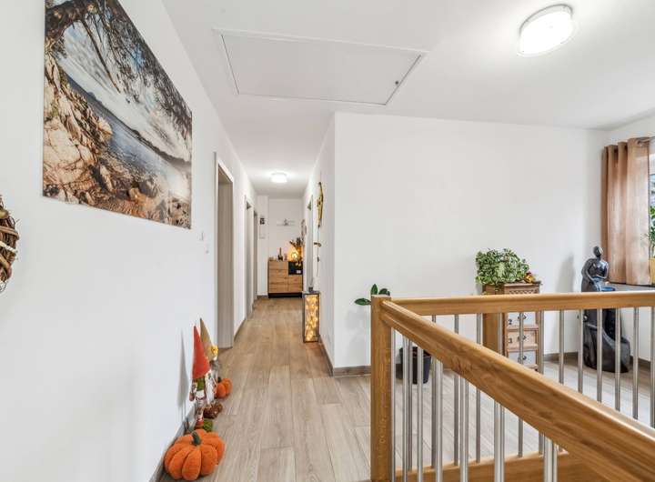 Im Untergeschoss bieten drei Kellerräume mit ca. 44 m² viel Lagerfläche. In einem Heizraum und in einem Technikraum ist die moderne Haustechnik untergebracht: die Luft-Wärme-Pumpe, der 12 kWh-Batteriespeicher für die PV-Anlage (26,79 kWp) und die Schwimmbadtechnik. Zur technischen Ausstattung des Hauses gehören auch 11 Lüfter, teilweise elektrische Rollos, eine Wallbox und die Videoüberwachungsanlage des gesamten Grundstücks. Zur Straße hin bieten eine Einzelgarage und ein Carport drei Stellplätze.