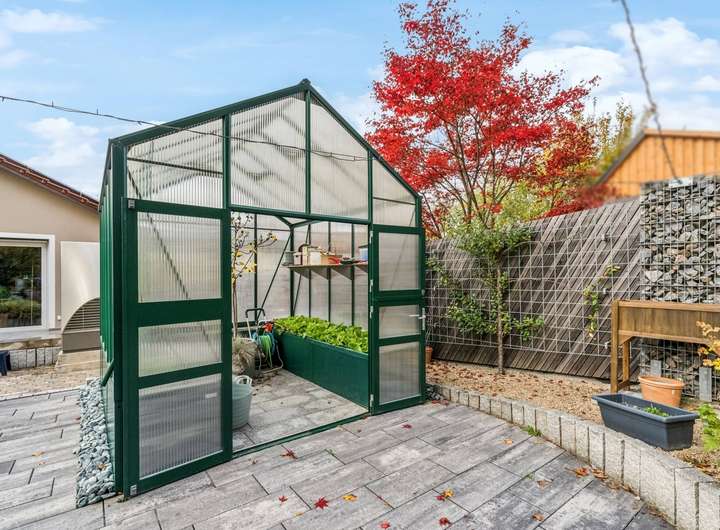 Das ca. 1.257m² große Grundstück ist auf drei Seiten von einer 2 m hohen Zaunanlage aus Steingabionen und waagrecht bzw. diagonal beplankten Holzfeldern umgeben. Der Garten ist wunderschön angelegt mit ausgewählten, von Granitsteinen eingefassten Sträuchern, Stauden und Rasenflächen. Ein mit Steinfliesen belegter und ebenfalls eingefasster Weg schlängelt sich durch den Garten bis zum rückwärtigen Ende. Hervorzuheben ist ein geräumiges Gewächshaus mit Hochbeet.
