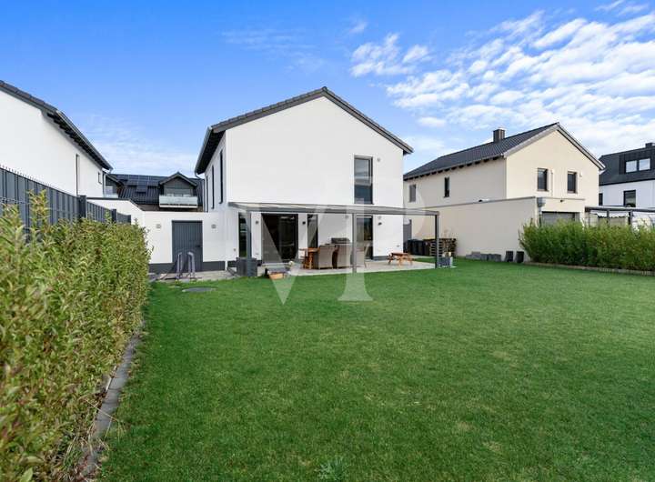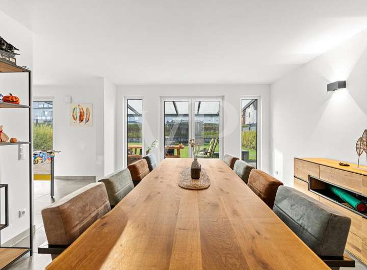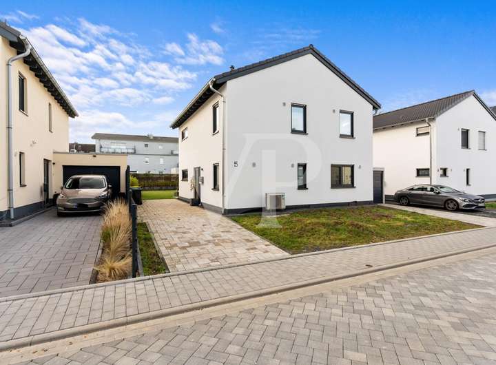 Dieses energieeffiziente Einfamilienhaus der Klasse A+ bietet 152 m² modernen Wohnkomfort in einer ruhigen Sackgasse eines attraktiven Neubaugebiets in Baesweiler. Der offene, lichtdurchflutete Wohn- und Essbereich mit hochwertiger Einbauküche und Kochinsel bildet das Herzstück des Erdgeschosses. Ergänzt wird es durch ein Gäste-WC und einen Hauswirtschaftsraum. Im Obergeschoss erwarten Sie vier flexibel nutzbare Zimmer – ideal als Schlafzimmer mit Ankleidebereich-, Kinder-, Gäste- oder Homeoffice-Räume – sowie ein komfortables Vollbad. Die rund 40 m² große, teilweise überdachte Terrasse lädt ganzjährig zu entspannten Stunden im Freien ein. Garage, drei Außenstellplätze, moderne Wärmepumpe und Fußbodenheizung sorgen für Komfort und Energieeffizienz.