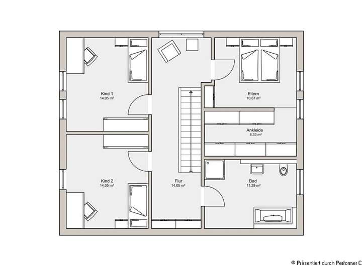 Über eine gerade Treppe gelangen Sie in den großen Flur im Dachgeschoss. Durch die Flachdachgaube ist hier Platz für eine gemütliche Sitzecke vor dem Fenster. Hier befinden sich ebenfalls zwei gleichgroße Kinderzimmer und ein Familienbad. Abgerundet wird diese Etage durch ein Elternschlafzimmer mit Ankleide.