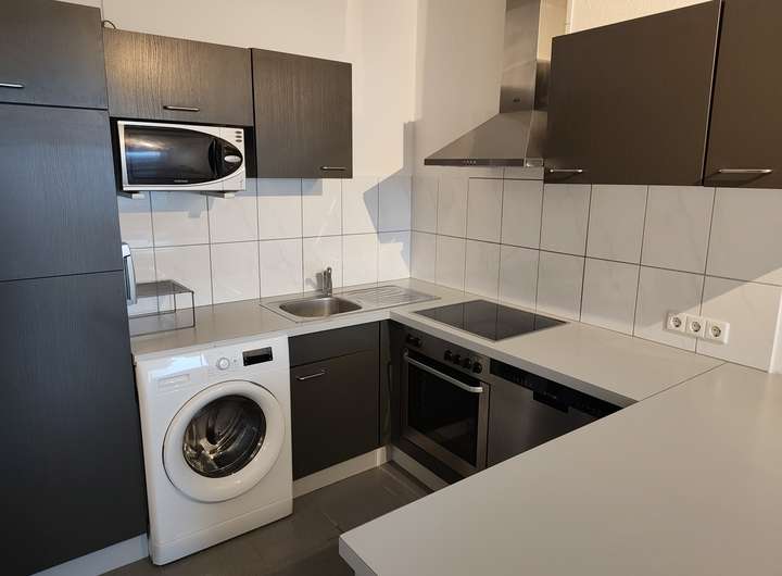 Die Wohnung verfügt über eine komplett ausgestattete Küche inkl. Waschmaschine, ein renoviertes Bad, ein separates WC und einen großzügigen Balkon.