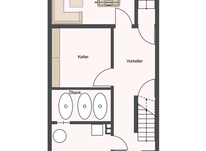 Er besteht aus einem Partyraum, Vorkeller, Haustechnikraum, einer Werkstatt bzw. Vorratskammer und einem Heizungsraum mit Zugang zu den Öltanks.