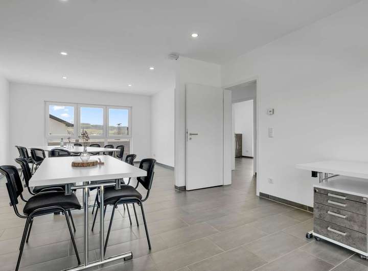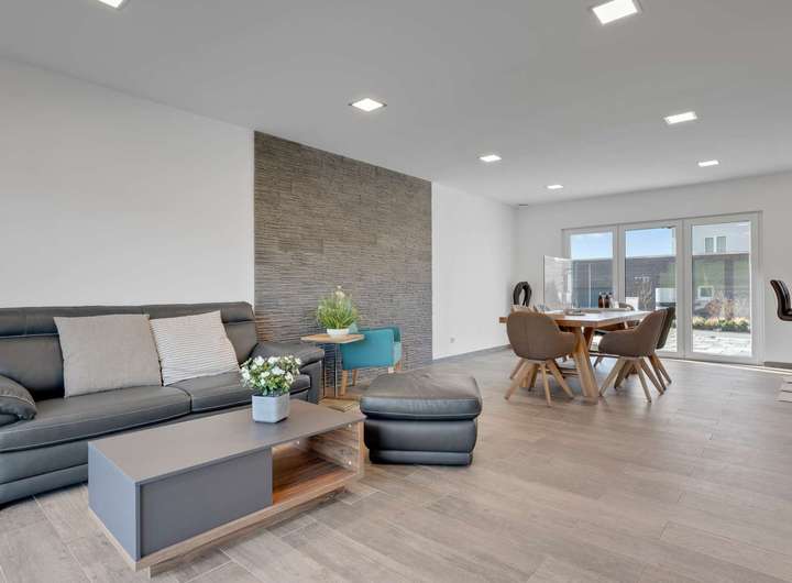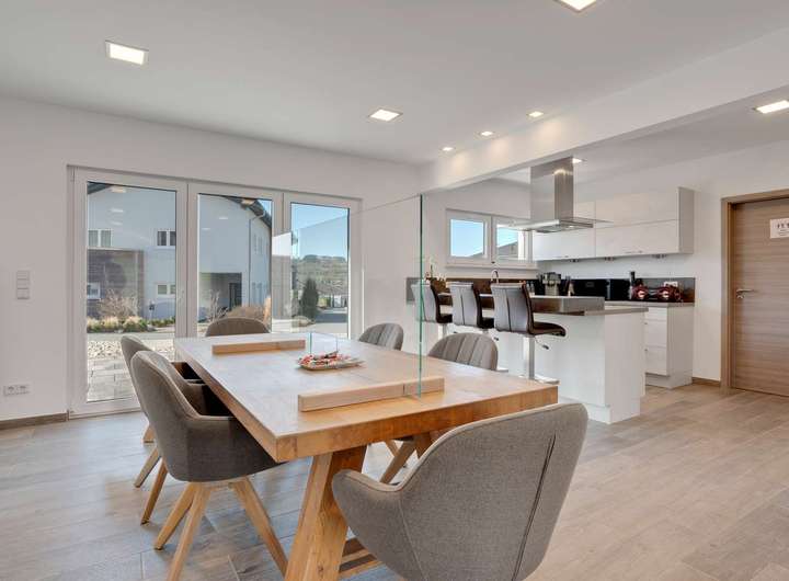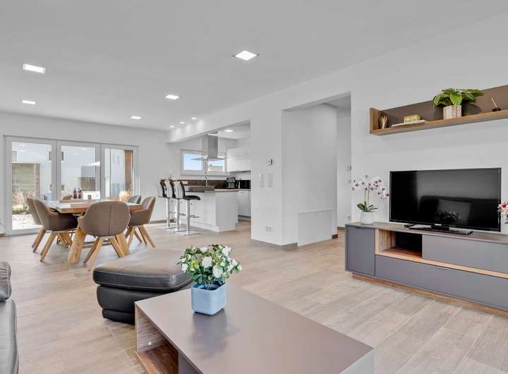 Schon beim Betreten durch den überdachten Eingangsbereich zeigt sich der durchdachte Grundriss: Vom Windfang mit stilvollem Gäste-WC gelangen Sie in die zentrale Diele, die in den offenen Wohn- und Essbereich mit angrenzender Küche führt. Dieser großzügige Raum mit 33,94m² ist dank bodentiefer Fenster lichtdurchflutet und bietet direkten Zugang zur 14m² großen Südterrasse. Die Küche ist mit hochwertigen Geräten und einer eleganten Bar ausgestattet – alles in unbenutztem Neuzustand. Im Erdgeschoss befinden sich außerdem ein Technikraum mit Anschlüssen für Waschmaschine und Trockner sowie frostgeschützte Außenwasserhähne. Über eine edle Eichentreppe mit doppeltem Geländer erreichen Sie das Obergeschoss. Hier erwarten Sie drei helle Räume, allesamt mit bodentiefen Fenstern. Das großzügige Schlafzimmer misst 14,33m², aktuell sind zwei Zimmer zu einem 33,64m² großen Arbeitsbereich zusammengefasst, lassen sich aber bei Bedarf einfach trennen. Das Hauptbad punktet mit bodentiefer Regendusche, Badewanne, Handtuchheizkörper und hochwertiger Fliesenauswahl. LED-Spots, durchgängig verlegte Holzfliesen und Fußbodenheizung sorgen überall für stilvollen Komfort.