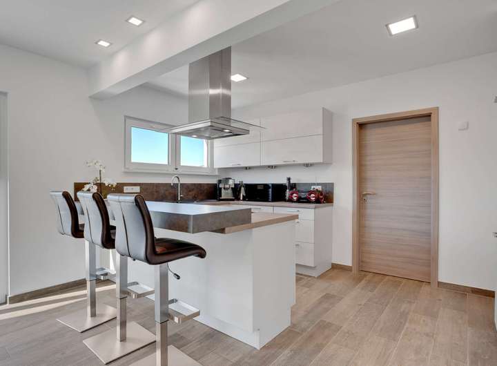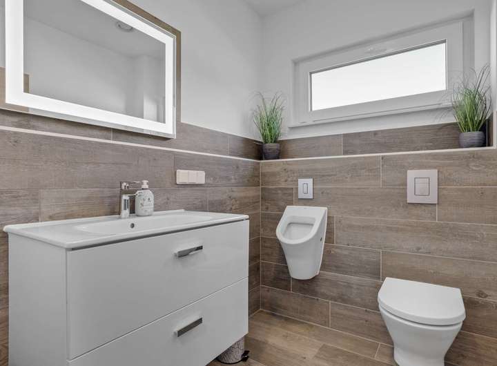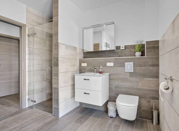 - Hochwertige Holzfliesen, LED-Spots, Designbad