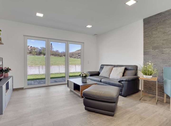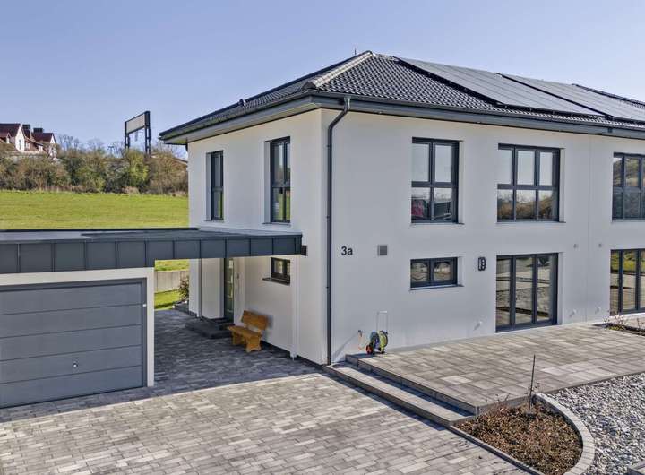 Das 2017 erbaute Haus überzeugt durch eine energieeffiziente Holzständerbauweise, wie sie von Danwood bekannt und geschätzt ist. Dank engobierter Tondachziegel in Anthrazit, einer modernen PV-Anlage mit 3,72kWp und einem Speicher mit 6kWh profitieren Sie von nachhaltiger Energieversorgung. Die Fußbodenheizung in allen Wohnräumen wird über eine Wärmepumpe betrieben, ergänzt durch eine aktive Be- und Entlüftungsanlage. Dreifach verglaste Kunststofffenster mit elektrischen Alurollläden sorgen für optimale Wärmedämmung. Alle technischen Installationen – von moderner Elektrik über stabile Kunststoffleitungen bis hin zu DSL mit bis zu 100Mbit/s – sind auf dem neuesten Stand. Der Zustand ist makellos – wie neu.