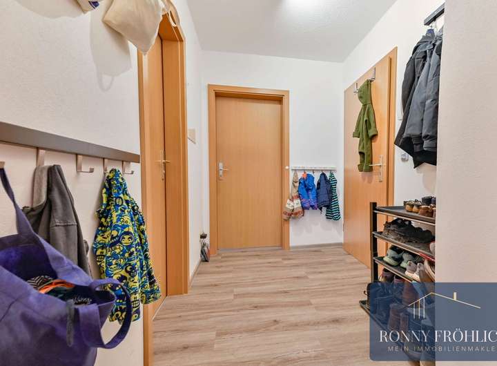 Vom geräumigen Flur aus erreichen Sie alle Räume der Wohnung. Das große Wohnzimmer überzeugt durch seine Helligkeit und bietet direkten Zugang zur angrenzenden Küche, die mit einer hochwertigen Einbauküche ausgestattet ist.