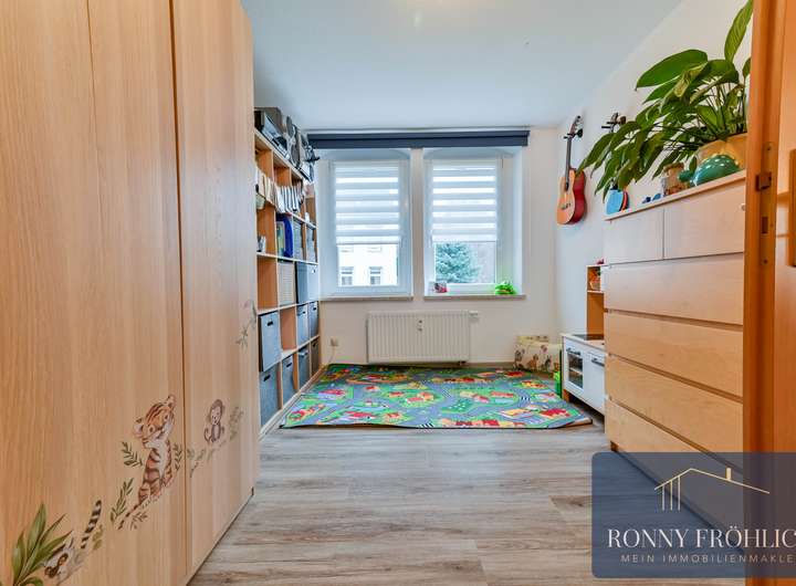 Weiterhin verfügt die Wohnung über ein Schlafzimmer mit viel Platz, ein weiteres Zimmer (ideal als Kinder-, Arbeits- oder Gästezimmer) sowie ein Badezimmer mit Badewanne.