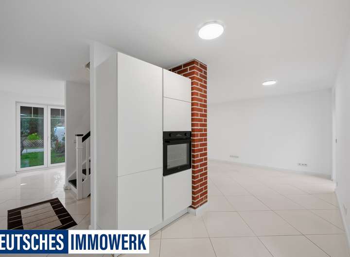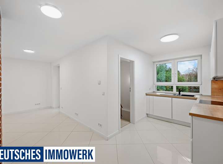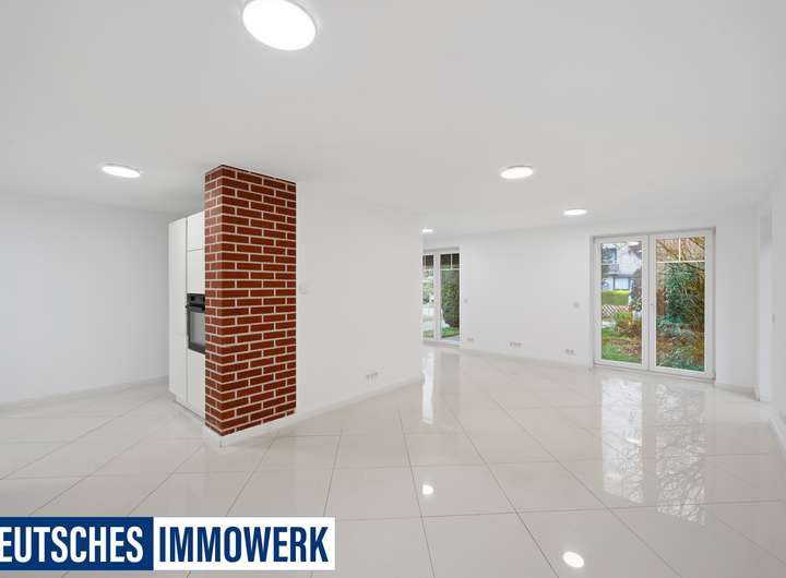Linker Hand gelangen Sie in die einladende Garderobe mit ausreichend Platz für einen Schrank und/oder einer Kommode. Rechter Hand erreichen Sie das großzügige und moderne Gäste-WC, ausgestattet mit Tageslicht, WC, einem Waschbecken, Handtuchheizkörper und einer Dusche. Geradezu von der Diele kommend erblicken Sie das Herzstück der Immobilie, den lichtdurchfluteten offenen Wohn- und Essbereich. Dieser Raum verbindet Wohnen, Essen und die offene Küche zu einem harmonischen Kreislauf. Die offene Wegführung schafft nicht nur kurze Wege, sondern auch ein Gefühl von Weite. Hier ist genügend Platz für ein gemütliches Zusammentreffen mit der Familie auf dem Sofa samt Fernsehecke sowie für einen großen Esstisch. Zudem überzeugt das einladende Wohn- und Esszimmer mit viel Tageslicht durch die zahlreichen bodentiefen Fenster und schafft eine angenehme Atmosphäre, die den perfekten Ort für gemeinsame Mahlzeiten und gemütliche Stunden anbietet. Aus den zahlreichen Fenstern schauend, erblicken Sie den großzügigen Garten. Von hier aus erhalten Sie durch ein bodentiefes Fensterelement direkten Zugang zur Terrasse und zum Garten. Die geräumige offene Küche lädt förmlich zum Kochen und Plauschen ein und ist mit allen erforderlichen Unter- und Oberschränken sowie Elektrogeräten ausgestattet, die im Objekt bestehen bleiben.
