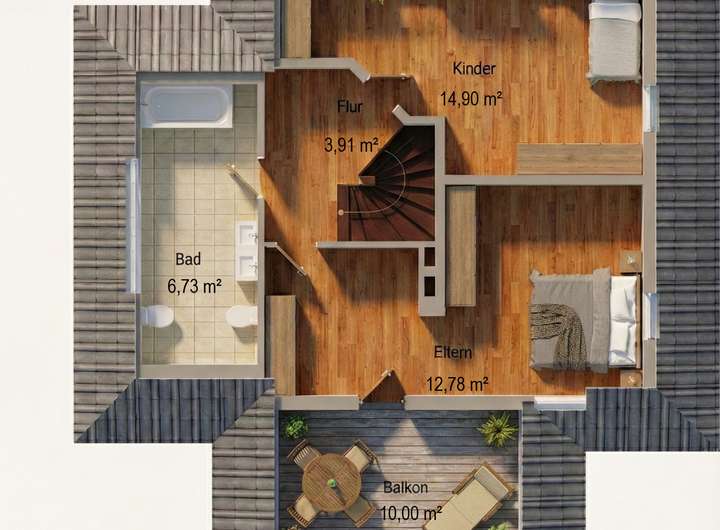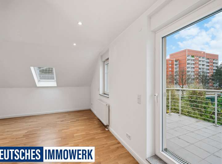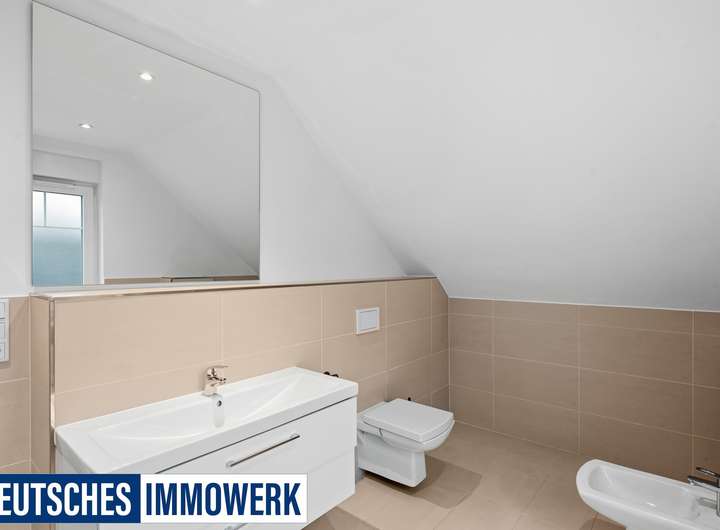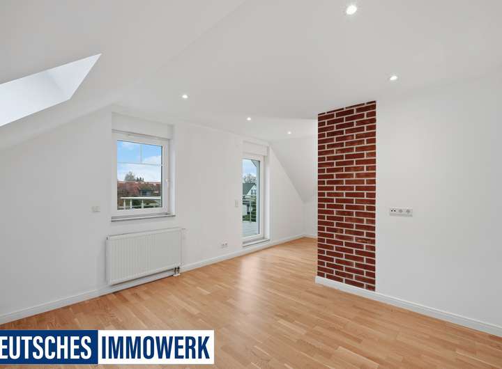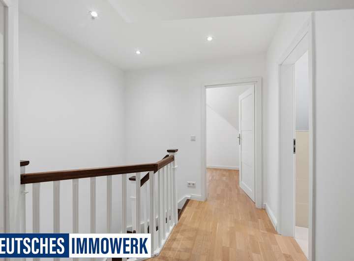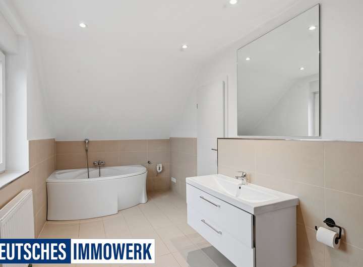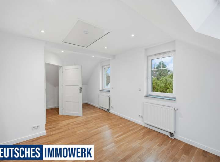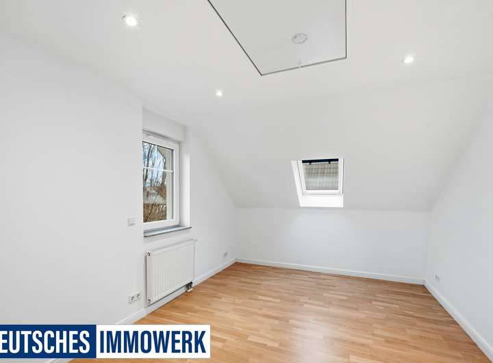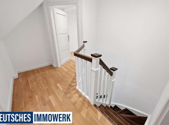 Eine moderne und massive Vollholztreppe durchzieht sich über das Erd-, und Dachgeschoss und setzt einen weiteren Akzent in dieser schönen Immobilie. Über diese gelangen Sie zunächst in das voll ausgebaute Dachgeschoss. Von der Diele aus gehen zwei großzügige Schlaf- sowie ein modernes Badezimmer ab.