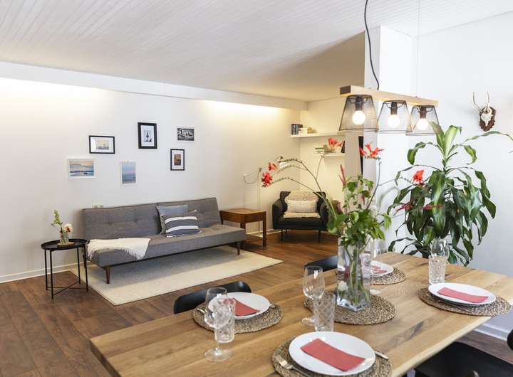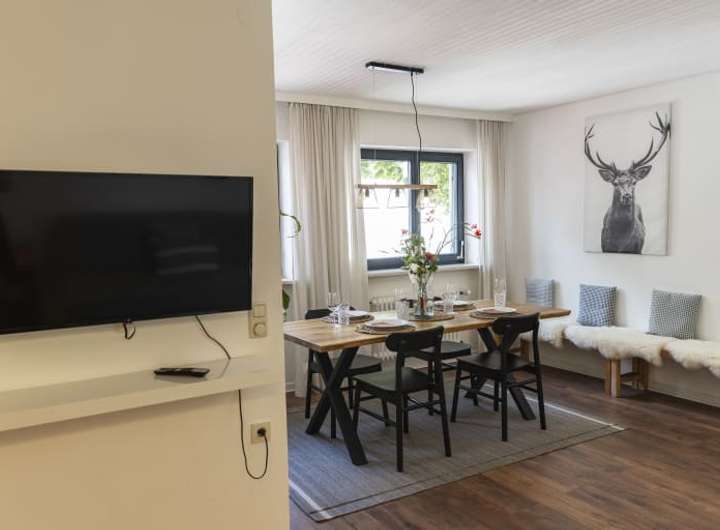Der helle Wohnbereich ist geschmackvoll eingerichtet mit Couch, Sesseln und Smart-TV. Die angrenzende Essecke mit Holztisch, Stühlen und Sitzbank schafft eine angenehme Atmosphäre für gemeinsame Mahlzeiten und Gespräche.
