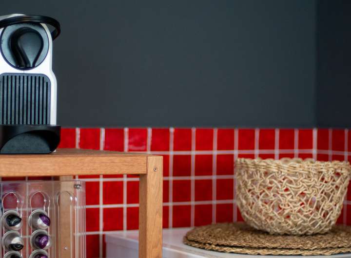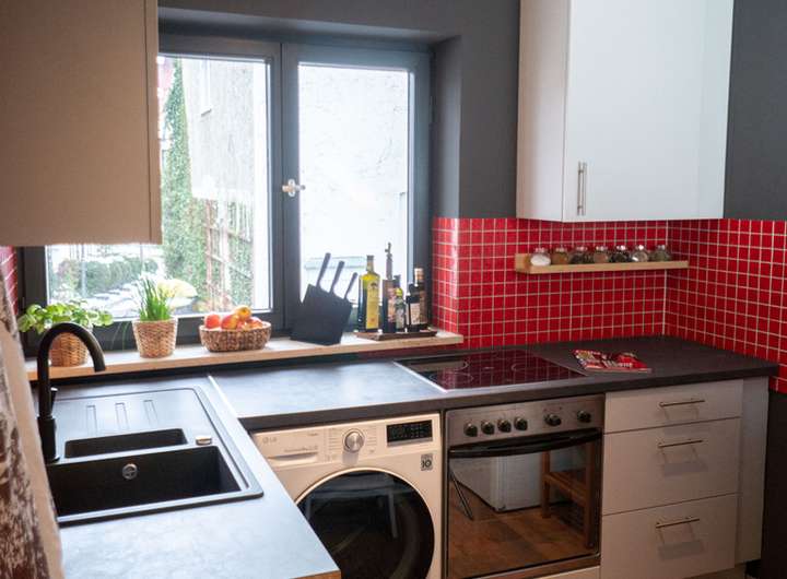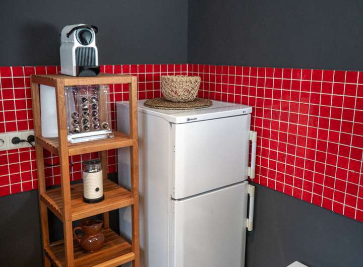 Herd, Kühlschrank, Nespresso-Maschine, Wasserkocher, Toaster, Waschmaschine sowie Geschirr, Küchenutensilien und Grundausstattung sind vorhanden.