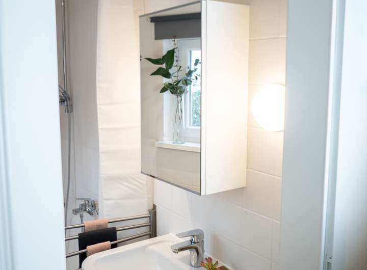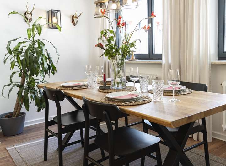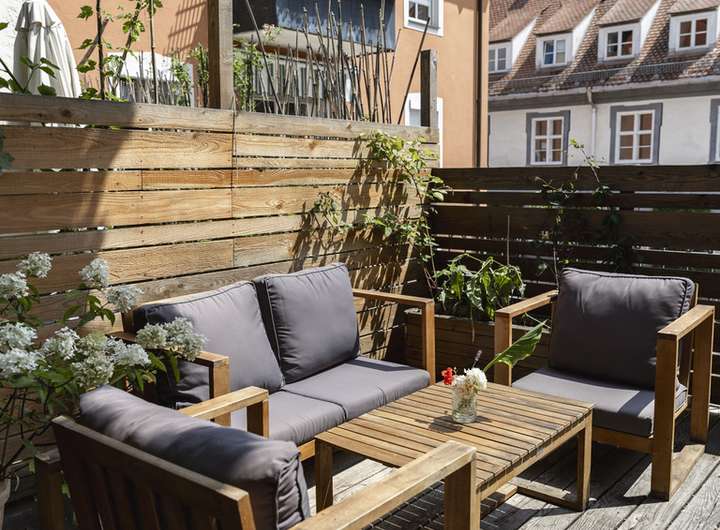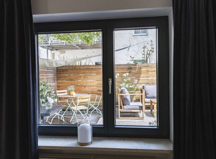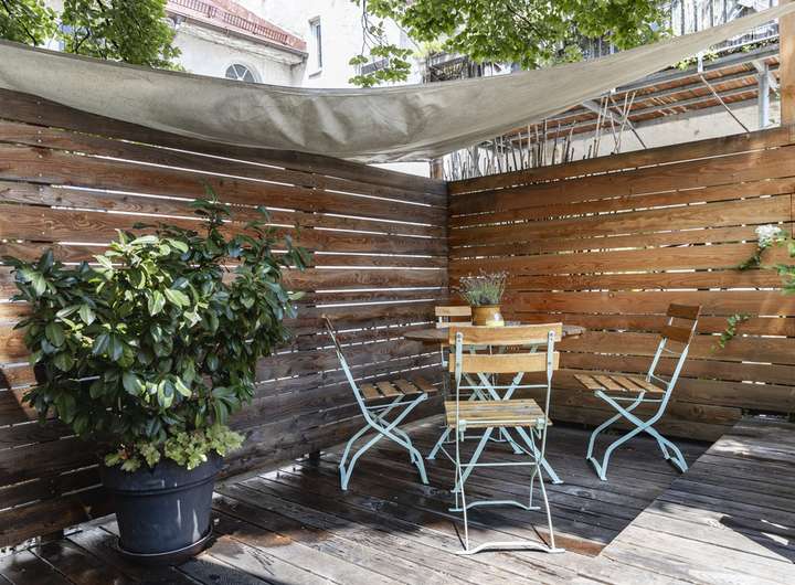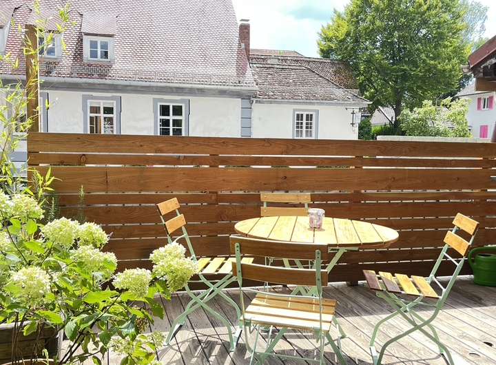 Ein besonderes Highlight ist die sonnige Dachterrasse, möbliert mit Tisch und Stühlen und beschattet von einer alten Linde. Hier lässt sich der Alltag entspannt genießen – beim Lesen, Frühstücken oder bei gemeinsamen Mahlzeiten im Freien. Ein Gasgrill steht ebenfalls zur Verfügung.