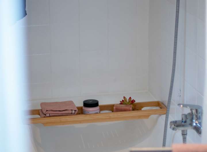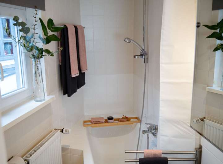 Das Badezimmer bietet Fußbodenheizung, eine Badewanne sowie eine Duschvorrichtung.