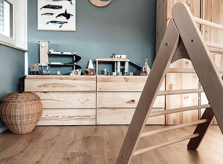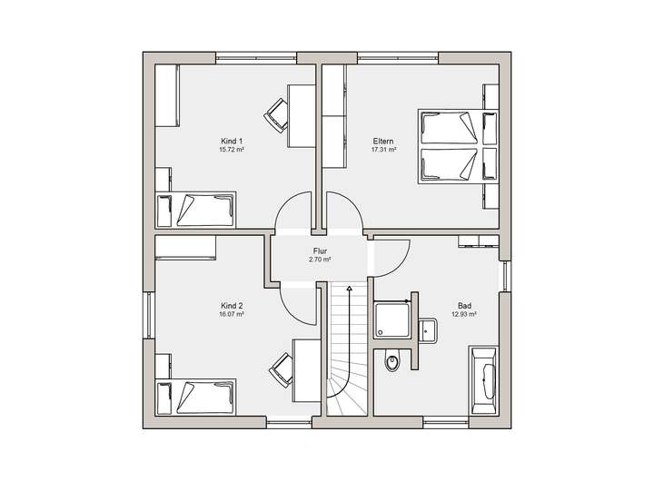 Das Obergeschoss des Architektenhauses erreichen Sie über die Treppe. Diese führt in zwei Kinderzimmer, ein Elternschlafzimmer und das geräumige Familienbad.