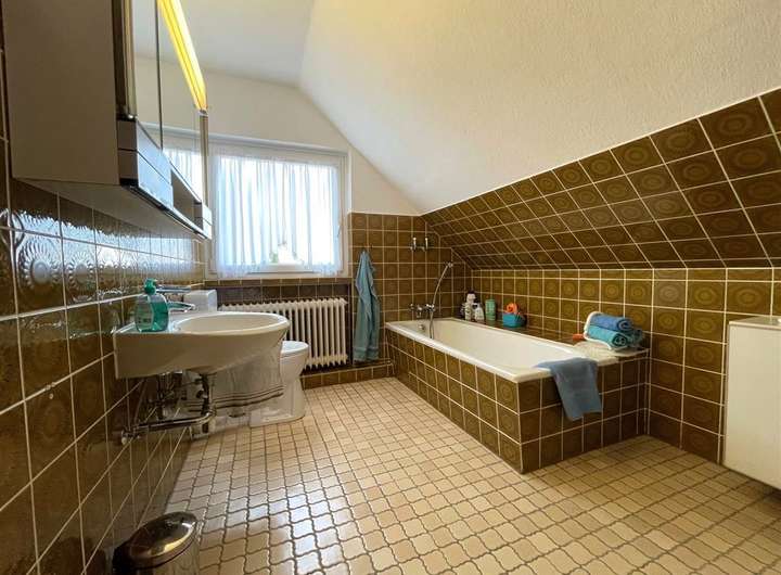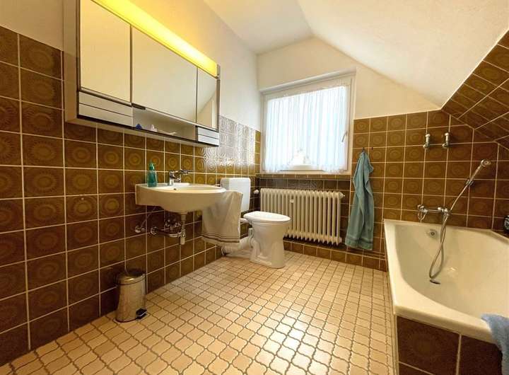 Im OG der Immobilie empfängt Sie ein großzügiger Galeriebereich. Weiterhin sind auf dieser Etage drei Schlafzimmer sowie ein Bad mit Wanne, Waschtisch und WC sowie ein separates WC untergebracht. Die Badbereiche sind mit weißen Sanitärobjekten und braunen Fliesen ausgestattet. Hierbei handelt es sich um die Erstausstattung aus dem Baujahr. Vorhandene Ablageflächen bieten ausreichend Platz für Handtücher und Pflegeprodukte.